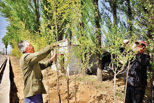 代縣縣委、縣政府堅持“生態(tài)綠色發(fā)展,共建美好家園”的執(zhí)政理念,今春鋪開了總投資1120 萬元的108 國道東段通道綠化工程、投資2000 多萬元的鞏固退耕還林項目干果經(jīng)濟林工程和京津風(fēng)沙源治理工程以及全民義務(wù)植樹工程,切實做到規(guī)劃高起點、施工高質(zhì)量、建設(shè)高標準、開發(fā)高效益。代縣作為京津地區(qū)的風(fēng)沙源頭,通過歷年堅持不懈的生態(tài)綠化,全縣已擁有林地面積171 萬畝,占到總國土面積的66.3%,基本實現(xiàn)了“春季花滿坡、夏季綠蔭濃、秋季五彩畫、冬季松柏青”的美好愿景,為京津地區(qū)筑起了防風(fēng)固沙綠色屏障。圖為工人們在修剪樹株。(石俊文 攝)
