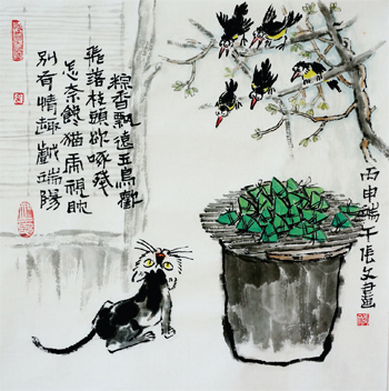 忻州知名節(jié)目主持人“二黃毛”看到這幅漫畫后,詩興大發(fā):“粽香飄遠(yuǎn)玉鳥歡,飛落枝頭欲啄殘;怎奈饞貓虎視眈,別有情趣戲端陽。”張文覺得老同學(xué)“二黃毛”的詩詮釋了畫意,于是將四句詩題寫于畫上,詩與畫頓時渾然天成。