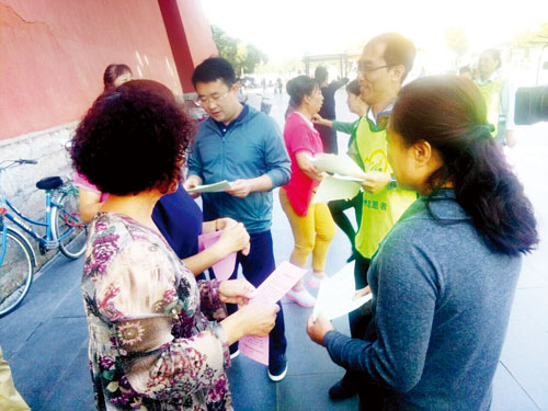 9月7日上午,共青團忻州市委組織青年志愿者走上街頭,撿垃圾、清理小廣告、為市民發(fā)放創(chuàng)衛(wèi)宣傳資料,用自己的實際行動倡導大家一起愛護環(huán)境,講究衛(wèi)生,養(yǎng)成良好的生活衛(wèi)生習慣,加入到我市創(chuàng)衛(wèi)的行列中來。圖為青年志愿者在古城廣場向過往市民發(fā)放創(chuàng)衛(wèi)宣傳資料。(張志遠 攝)