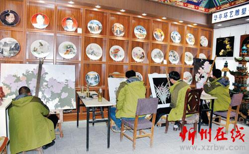 推光漆器是代縣傳統(tǒng)手工藝品,以其古樸典雅、獨(dú)具特色、充滿雁門風(fēng)情而走俏市場。推光漆器的制作過程頗為繁雜,要經(jīng)過制胚、披麻、刮泥、油漆、推光、彩畫、罩漆、銅工等八道工序,尤其是推光彩畫部分,用色濃麗飽滿、鮮艷奪目。圖為代縣華亭環(huán)藝雕塑有限公司的工匠們正在創(chuàng)作推光漆器。(石俊文 攝)