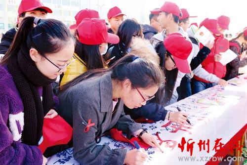 12月1日,在第29個(gè)“世界艾滋病日”到來(lái)之際,我市在忻州體育廣場(chǎng)啟動(dòng)了主題為“攜手抗艾,重在預(yù)防”的艾滋病防治宣傳活動(dòng)。活動(dòng)現(xiàn)場(chǎng),來(lái)自市疾控中心、健康教育所等單位的工作人員以及忻州師院的志愿者們通過(guò)展板、宣傳欄、發(fā)放資料的形式向市民講解了艾滋病傳播途徑、艾滋病流行現(xiàn)狀與危害、如何預(yù)防艾滋病等方面的知識(shí)。工作人員現(xiàn)場(chǎng)為市民答疑解惑,呼吁廣大市民用科學(xué)、理性的態(tài)度正確認(rèn)識(shí)艾滋病,不歧視艾滋病病毒感染者。圖為志愿者在條幅上簽名(實(shí)習(xí)記者 王菲 王君 攝影報(bào)道)