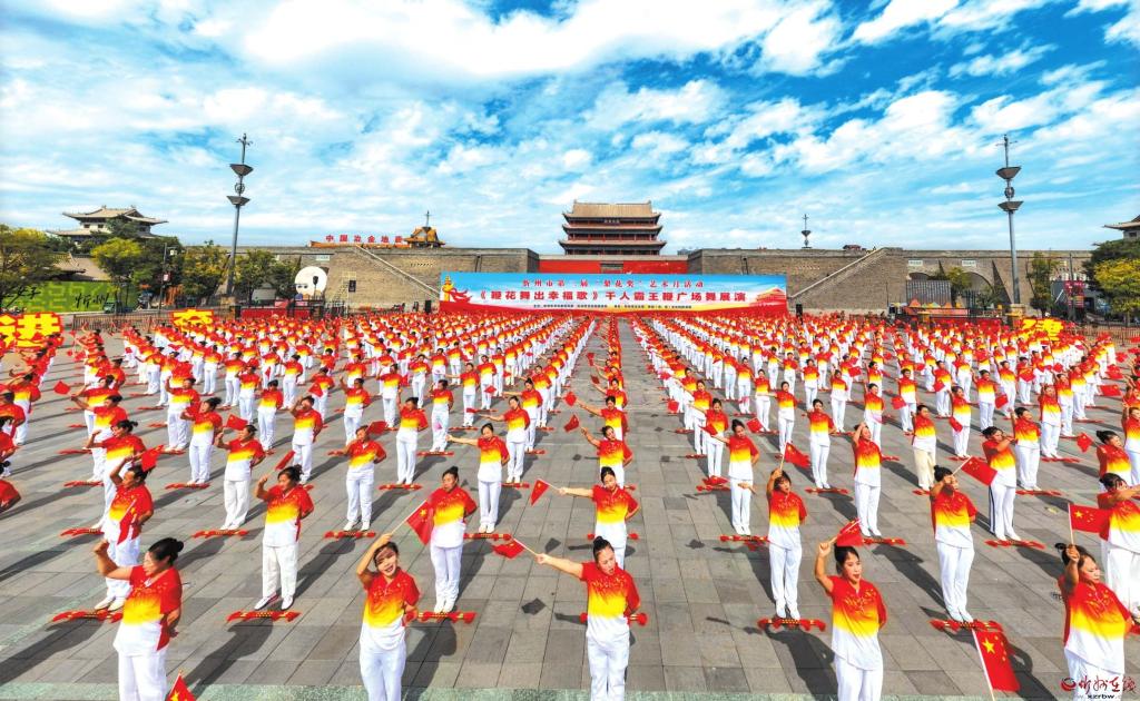 9月26日,來自全市14個縣(市、區(qū))代表隊的近千名舞者齊聚忻州古城,伴隨著配樂《鞭花舞出幸福歌》的激揚曲調,共同演繹霸王鞭廣場舞,并齊聲合唱《歌唱祖國》,為即將到來的國慶節(jié)獻禮?;顒又?,演員們整齊劃一的動作、昂揚向上的精神風貌,生動展現(xiàn)了對美好生活的向往,得到了廣泛好評。常麗琴攝