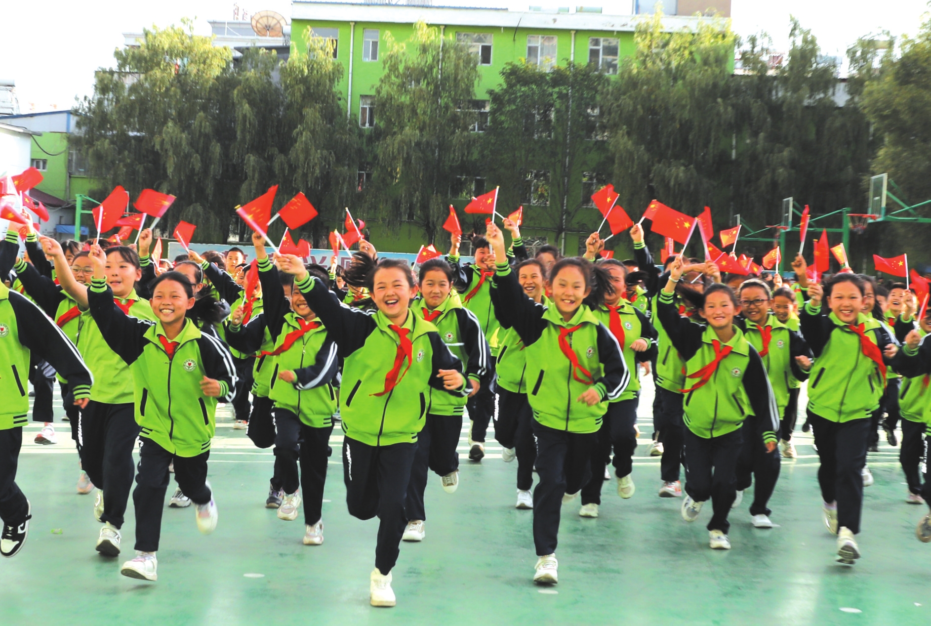 原平市第一小學的小學生揮舞著國旗,喜迎國慶。褚震攝