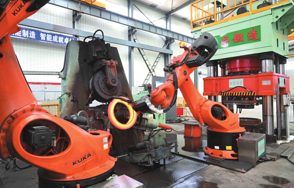 定襄縣秉持“綠色發(fā)展,科技創(chuàng)新”理念,大力推進法蘭鍛造行業(yè)的裝備升級換代,變精密制造為智能制造。全縣二十多家企業(yè)實現(xiàn)生產(chǎn)智能化改造,生產(chǎn)效率提高了百分之五,成本降低了百分之六,經(jīng)濟效益大幅提高。圖為山西良品鍛造有限公司法蘭流水線機器人智能化生產(chǎn)作業(yè)。(張晉蘭攝)