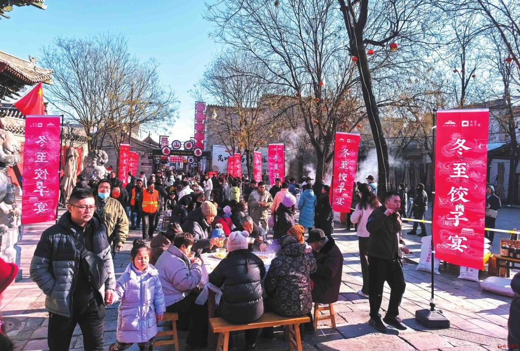 12月21日,忻州古城一年一度的冬至餃子宴在泰山廟巷開席,千余名市民和游客歡聚在這里,吃餃子、聽曲藝,共迎冬至。(