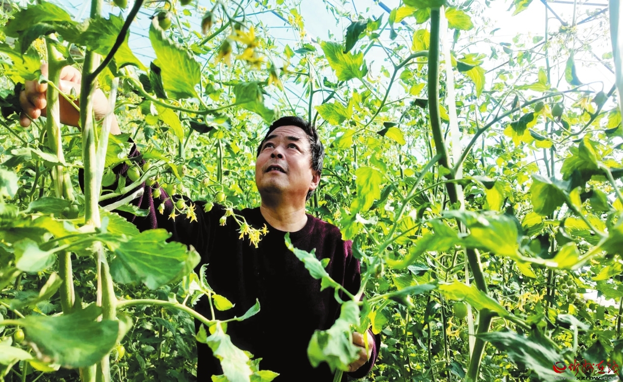 武文光察看圣女果長勢。本報記者 劉 捷攝