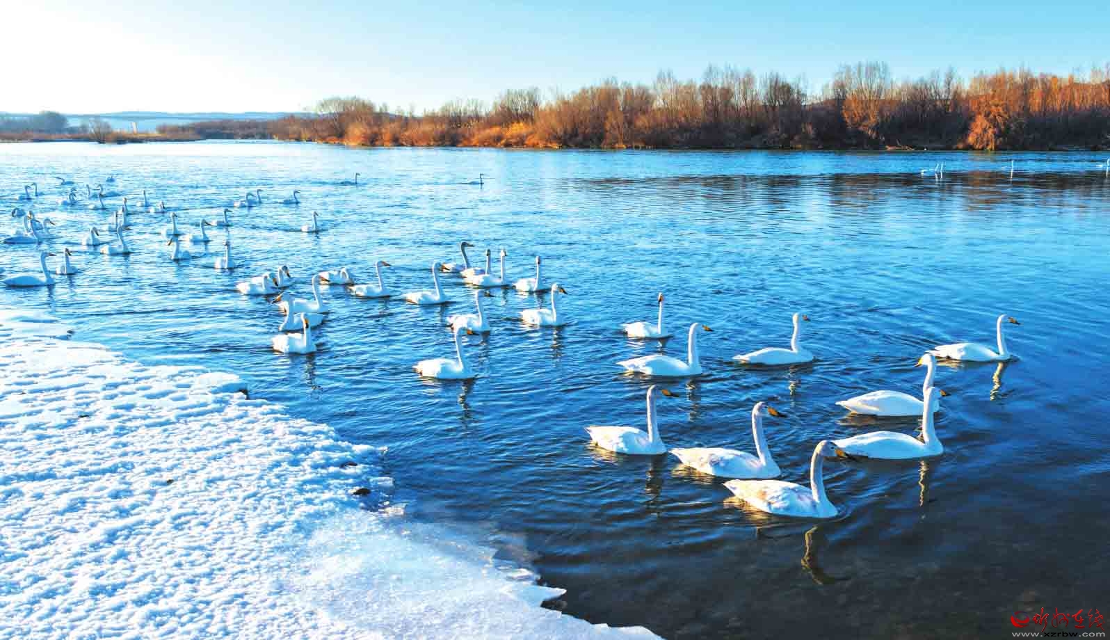 春節(jié)期間,黃河河曲段迎來(lái)了大規(guī)模越冬白天鵝,潔白的天鵝在黃河水域中游弋、嬉戲,勾勒出一幅自然生態(tài)和諧的美麗畫(huà)卷。(記者 張存良攝)