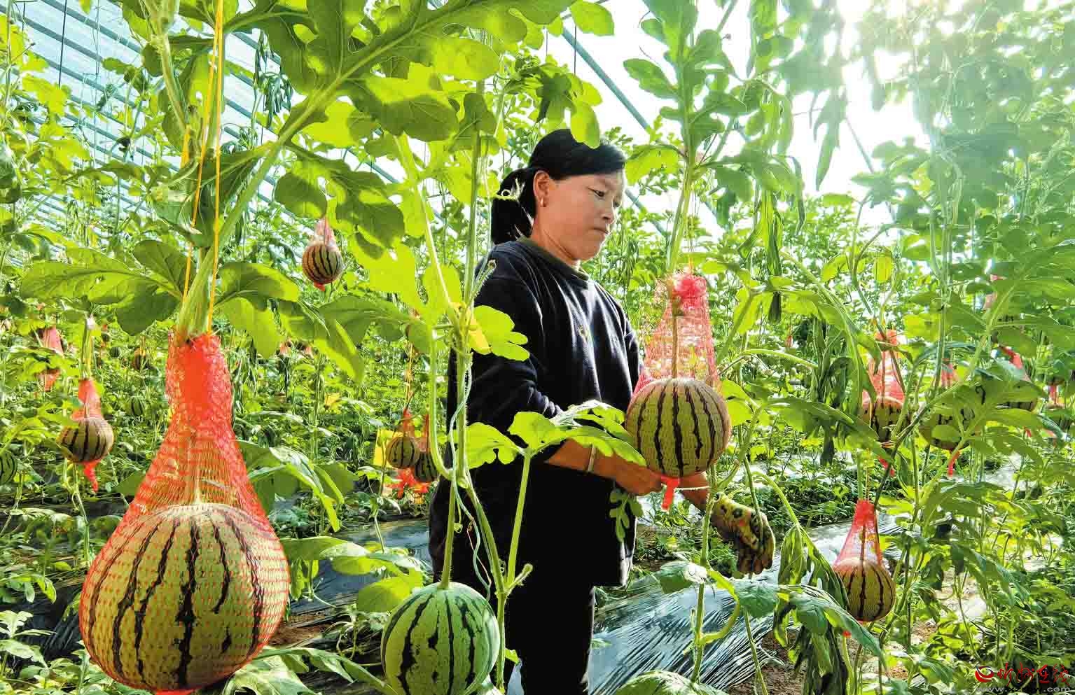 寧武縣充分發(fā)揮地域優(yōu)勢,把設施蔬菜產業(yè)作為鞏固拓展脫貧攻堅成果同鄉(xiāng)村振興有效銜接的有力抓手,積極扶持、鼓勵農民大力發(fā)展周期短、產量高、單價高的設施蔬菜產業(yè),帶動群眾增收致富。圖為鳳凰鎮(zhèn)周家堡村農民在大棚采摘西瓜。(記者劉紀森攝)