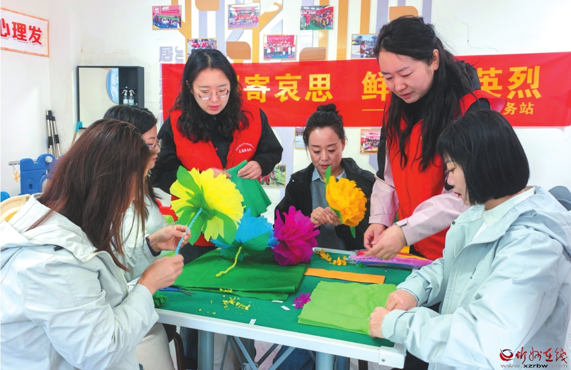 清明寄哀思,文明樹新風(fēng)。定襄縣南城社區(qū)組織工作人員與社區(qū)居民手工制作祭祀花,并免費(fèi)向社區(qū)居民發(fā)放,引導(dǎo)大家摒棄燒紙陋習(xí),以環(huán)保、溫情的方式追思先人。圖為社區(qū)工作人員與居民一同制作手工祭祀花。 (郭婧蕾攝)