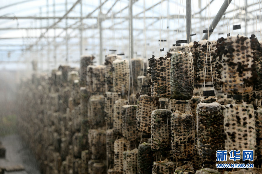 木耳菌袋每天要澆水10個(gè)多小時(shí),張秀榮的大棚里安裝了自動(dòng)噴灌設(shè)備。新華網(wǎng)曹楨攝