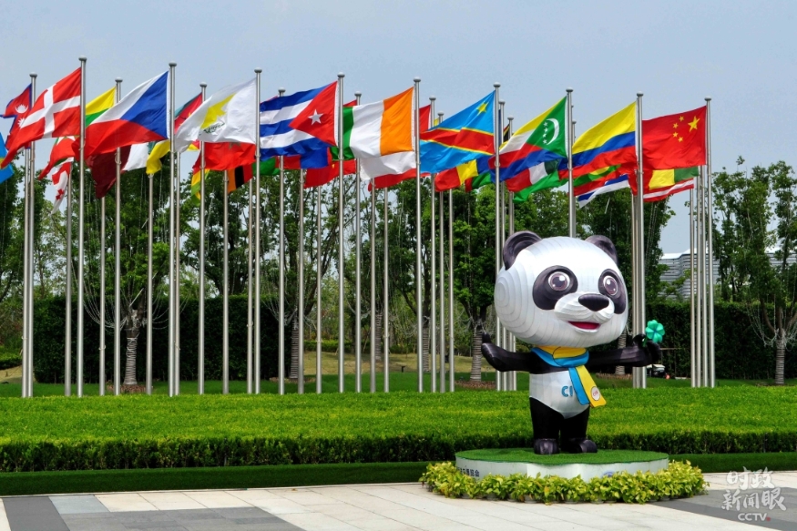 △7月27日,第三屆進(jìn)博會倒計時100天,場館外參展國國旗飄揚。