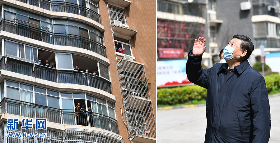 3月10日,習(xí)近平專門赴湖北省武漢市考察新冠肺炎疫情防控工作。這是習(xí)近平在東湖新城社區(qū)考察時(shí),向在家隔離居住的居民揮手致意、表示慰問(wèn)(拼版照片)。 新華社記者 謝環(huán)馳 攝