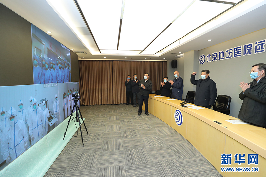 2月10日,習(xí)近平在北京調(diào)研指導(dǎo)新冠肺炎疫情防控工作。這是習(xí)近平在首都醫(yī)科大學(xué)附屬北京地壇醫(yī)院遠(yuǎn)程診療中心,通過(guò)視頻連線武漢市收治新冠肺炎患者的金銀潭醫(yī)院、協(xié)和醫(yī)院、火神山醫(yī)院,了解情況、聽取意見和建議,慰問(wèn)一線醫(yī)務(wù)工作者。 新華社記者 鞠鵬 攝