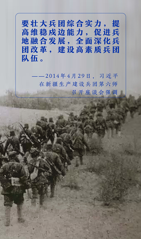 9月25日至26日,習(xí)近平總書記在第三次中央新疆工作座談會(huì)上強(qiáng)調(diào),要踐行胡楊精神和兵團(tuán)精神,激勵(lì)各級(jí)干部在新時(shí)代扎根邊疆、奉獻(xiàn)邊疆。