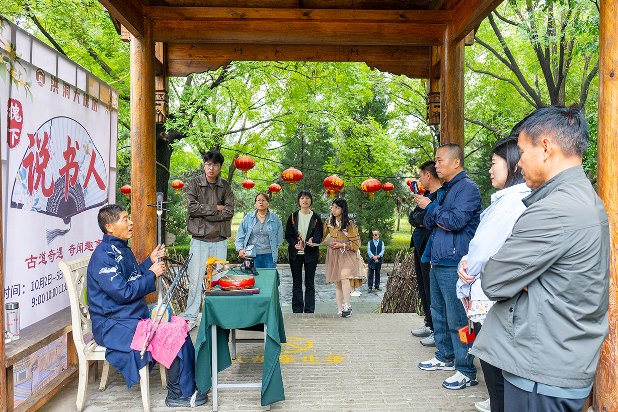 在景區(qū)西主干道“古道奇遇·奇聞趣事”現(xiàn)場,大槐樹下的說書人傾情說書,講述大槐樹下的文化軼事。悠揚古韻的聲音吸引著游客們紛紛駐足聆聽、拍照留念,沉浸在這份獨特的文化體驗當(dāng)中。