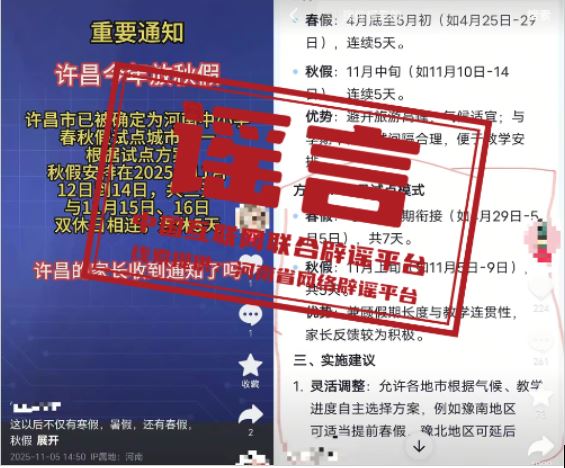 真相:近日,河南、安徽部分自媒體平臺發(fā)布關(guān)于中小學(xué)春秋放假的信息,聲稱“許昌市已被確定為河南中小學(xué)春秋假試點(diǎn)城市之一”“周口市中小學(xué)2025年秋假時間安排如下”“蕪湖市中小學(xué)將在11月12日至14日放首個秋假,連周末共5天”,引發(fā)關(guān)注。對此,河南許昌、周口及安徽蕪湖教育部門作出回應(yīng):并無放秋假的安排,網(wǎng)傳消息均為謠言。中小學(xué)放假安排需嚴(yán)格遵循國家教育方針政策及當(dāng)?shù)亟逃块T的統(tǒng)一部署,結(jié)合本地教育教學(xué)實(shí)際統(tǒng)籌規(guī)劃。如需了解相關(guān)安排,請通過屬地教育部門官方網(wǎng)站,切勿輕信、傳播未經(jīng)官方確認(rèn)的“小道消息”。(來源:“清朗河南”微信公眾號、@大河網(wǎng)、安徽網(wǎng)絡(luò)辟謠平臺)