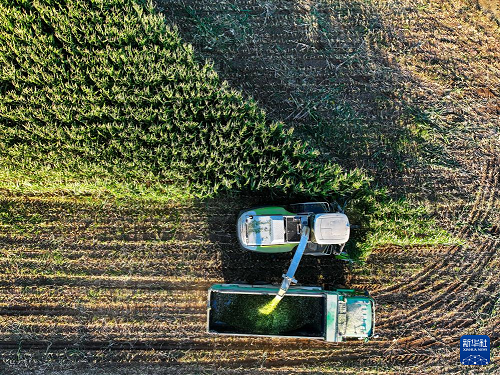 9月18日,在通遼市扎魯特旗巨日合鎮(zhèn),農(nóng)機(jī)在田間收割青貯玉米(無人機(jī)照片)。(新華社記者 連振 攝)