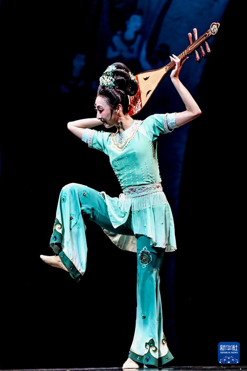 9月20日晚,演員在敦煌大劇院表演新版《絲路花雨》,展示經典舞姿“反彈琵琶”。(新華社記者 郎兵兵 攝)