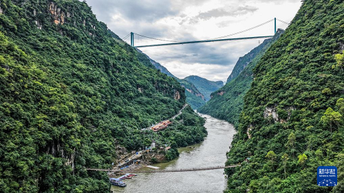 景區(qū)內(nèi)的索道橋與遠處的花江峽谷大橋遙相呼應(yīng)(9月27日攝,無人機照片)。(新華社記者 陶亮 攝)