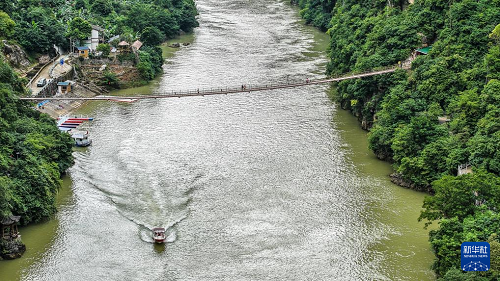 游客乘船游覽花江大峽谷景區(qū)(9月27日攝,無人機照片)。(新華社記者 陶亮 攝)