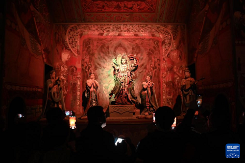 10月12日晚,洞窟式沉浸體驗(yàn)劇《樂動敦煌》精彩上演,為前來甘肅省敦煌市參加“世界市長對話·敦煌”活動的中外嘉賓上演一場精彩的文化盛宴。