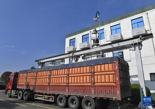 10月15日,在中儲(chǔ)糧成都青白江倉(cāng)儲(chǔ)有限責(zé)任公司,智能扦檢平臺(tái)在對(duì)剛運(yùn)來(lái)的糧食進(jìn)行隨機(jī)扦取樣品操作。(新華社記者 劉坤 攝)