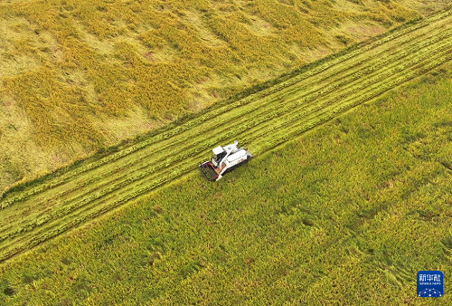 10月22日,湖南省衡陽(yáng)市衡山縣白果鎮(zhèn)村民駕駛農(nóng)機(jī)收割晚稻(無(wú)人機(jī)照片)。(新華社發(fā) 曹正平 攝)