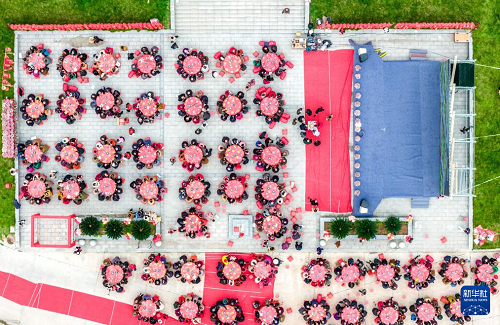 10月29日重陽節(jié),老人們在湖北省秭歸縣兩河口鎮(zhèn)太坪村參加長壽宴(無人機(jī)照片)。(新華社發(fā) 王罡 攝)