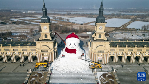 12月14日拍攝的建設中的哈爾濱市群力音樂公園網紅大雪人(無人機照片)。(新華社發(fā) 劉洋 攝)