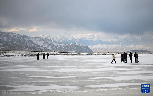 游客在賽里木湖的冰面上游玩(12月16日攝)。(新華社發(fā) 徐銳 攝)