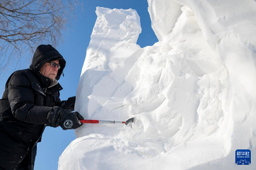 1月7日,在哈爾濱太陽島雪博會園區(qū),來自13個國家的25支代表隊百余位藝術家在寒冬中堅持藝術創(chuàng)作,精雕細琢雪雕作品。