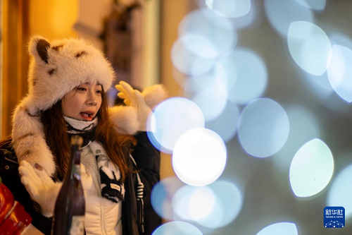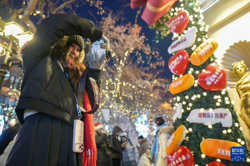 1月11日,游客在哈爾濱中央大街的肖克庭院游玩拍照。(新華社記者 王建威 攝)