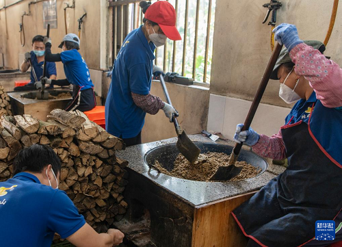 1月11日,海南省瓊海市嘉積鎮(zhèn)溫泉村一家作坊工作人員在翻炒山柚籽粉。(新華社發(fā) 蒙鐘德 攝)