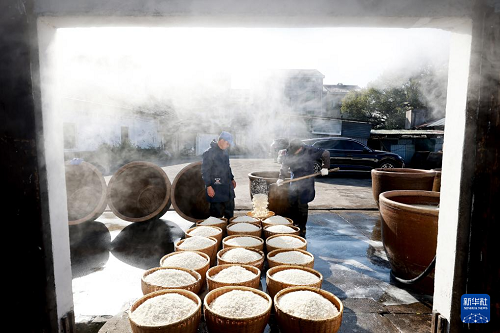 1月11日,在浙江省東陽市馬宅鎮(zhèn)屠梁村鐘山自然村,釀酒師傅在撈米。(新華社發(fā) 胡揚(yáng)輝 攝)