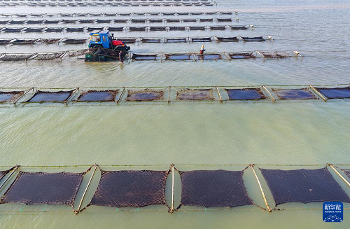 1月15日,養(yǎng)殖戶駕駛拖拉機(jī)趁著退潮出海采收紫菜(無人機(jī)照片)。(新華社發(fā) 徐書影 攝)