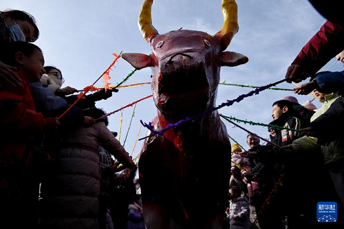 2月4日,人們在甘肅省敦煌市白馬塔景區(qū)“打春牛”。(新華社發(fā) 張曉亮 攝)