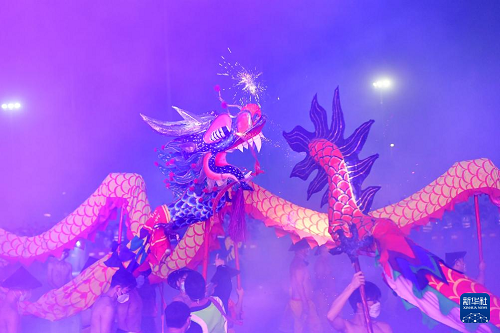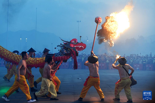 2月27日,在廣西賓陽縣炮龍文化廣場,人們在炮龍節(jié)上舞炮龍。(新華社記者 陸波岸 攝)