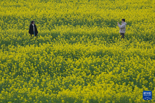 3月11日,游客在桐廬縣梅蓉村油菜花田間留影。(新華社記者 黃宗治 攝)