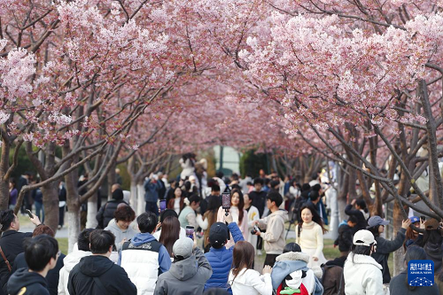 3月16日,人們在浙江省寧波市鄞州區(qū)文化廣場觀賞盛開的櫻花。(新華社發(fā) 胡嘉捷 攝)