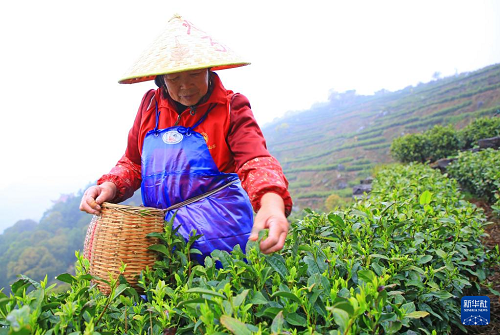 3月29日,采茶工在浙江省玉環(huán)市大麥嶼街道石峰山火山茶基地采摘明前茶。(新華社發(fā) 段俊利 攝)