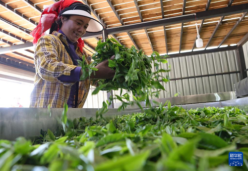 3月28日,云南省勐海縣勐混鎮(zhèn)賀開村茶農(nóng)攤開晾干茶葉鮮葉。(新華社發(fā) 李云生 攝)