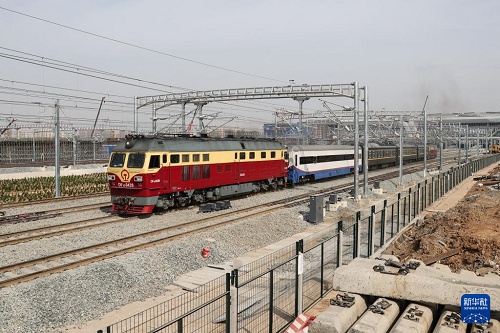 3月29日,檢測(cè)列車從建設(shè)中的西安東站駛出,開(kāi)往湖北鄖西站。(新華社發(fā) 劉翔 攝)