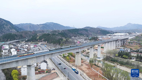 3月29日,檢測(cè)列車駛過(guò)中鐵二十局承建的西十高鐵南秦河特大橋(無(wú)人機(jī)照片)。(新華社發(fā) 郭晨 攝)