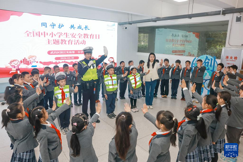 3月30日,在湖北省武漢市武昌區(qū)濱江實(shí)驗(yàn)第一小學(xué),交警指導(dǎo)學(xué)生體驗(yàn)交通安全手勢(shì)操。(新華社發(fā) 趙軍 攝)