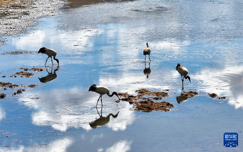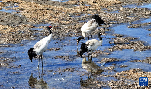 3月29日,黑頸鶴在嘎曲河紅原縣月亮灣段覓食。(新華社發(fā) 謝宏程 攝)