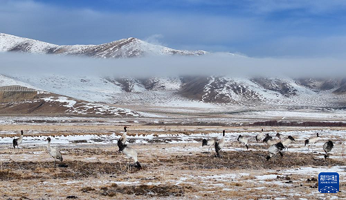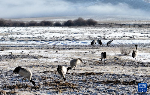 3月29日,黑頸鶴在四川省紅原縣的草原上覓食。(新華社發(fā) 謝宏程 攝)