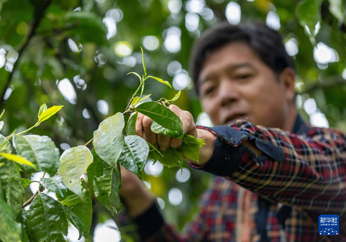 4月11日,重慶市南川區(qū)德隆鎮(zhèn)茶樹村,茶農在古茶樹上細心挑選優(yōu)質茶芽。(新華社發(fā) 羅川 攝)