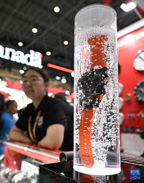 4月16日在第六屆消博會(huì)瑞士展臺(tái)拍攝的手表。(新華社記者 蒲曉旭 攝)