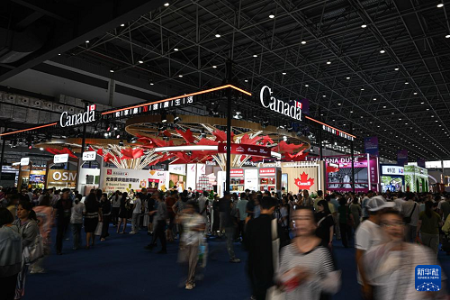 4月16日,第六屆消博會(huì)加拿大國(guó)家館所在的全球特色消費(fèi)展區(qū)人頭攢動(dòng)。加拿大是本屆消博會(huì)主賓國(guó)。(新華社記者 蒲曉旭 攝)
