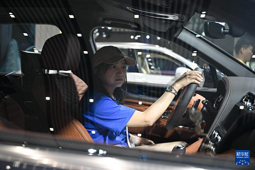 4月16日,觀眾在第六屆消博會(huì)現(xiàn)場(chǎng)體驗(yàn)英國(guó)賓利汽車。(新華社記者 蒲曉旭 攝)